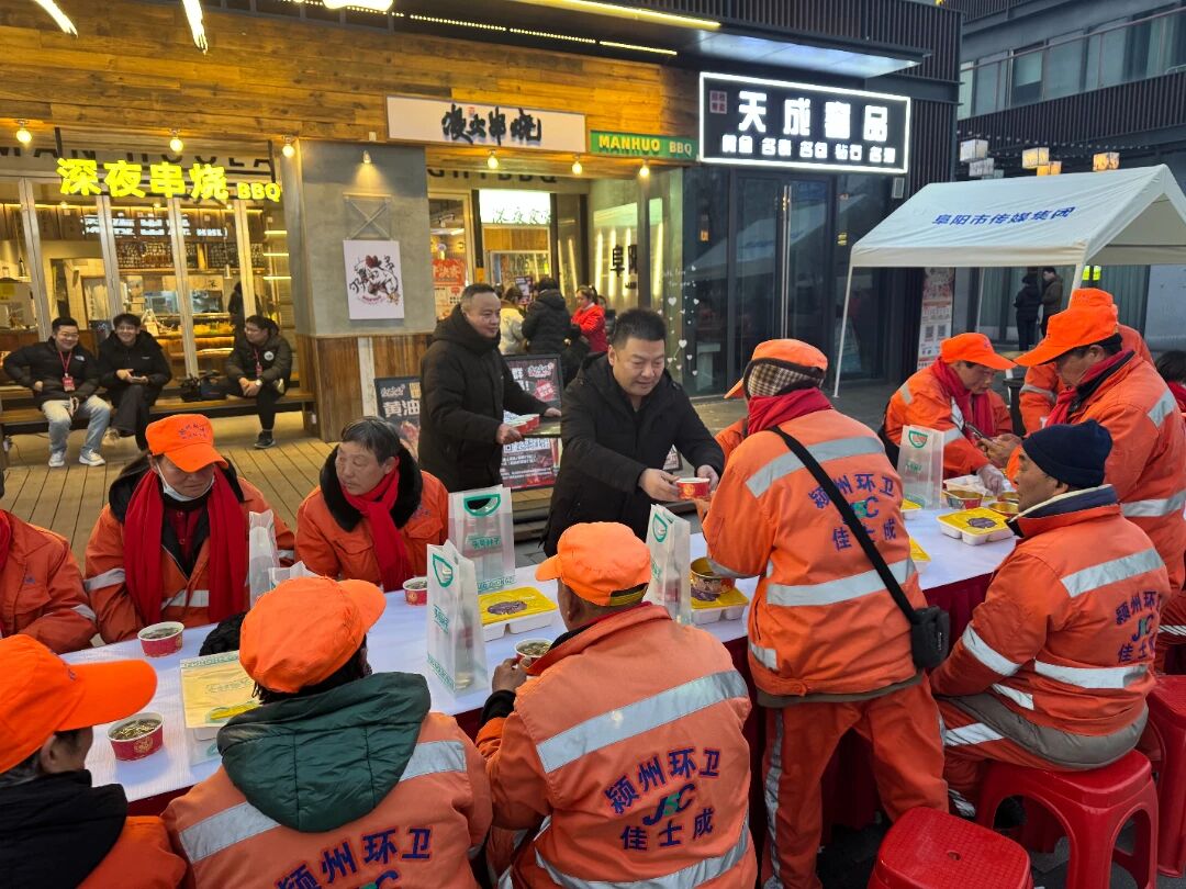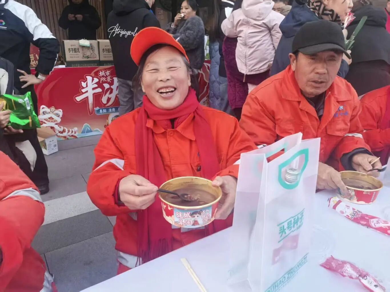 腊八节前夕,阜阳市清河宋街粥香四溢,温情流动。在“超级皖”美食争霸赛半决赛激烈角逐的同时,一场名为 “万人暖冬计划” 的公益行动温暖上演。本次活动由主办方联合颍州区城管局、餐饮协会及爱心企业共同发起。1月24日中午,佳士成环境科技阜阳分公司的150余名环卫工人受邀参加这场充满家乡风味的暖心长桌宴。